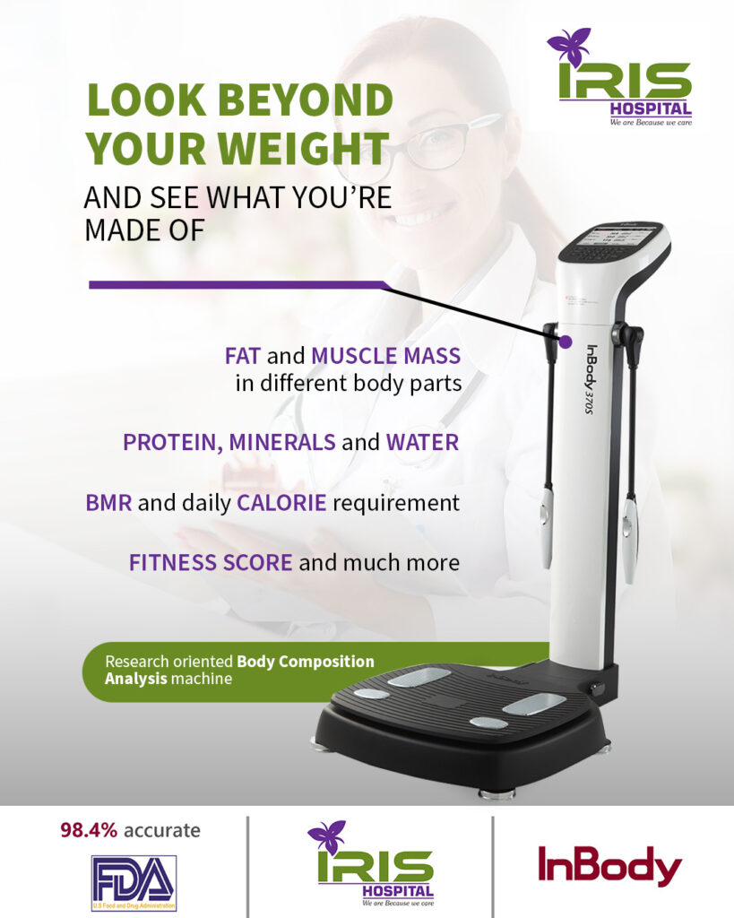 At IRIS Hospital, we are committed to offering the most advanced diagnostic tools to support comprehensive health evaluations. One such technology is the InBody Body Composition Analyzer, a cutting-edge, medically approved device designed to provide a detailed assessment of your body’s internal makeup—beyond what a regular weighing scale can offer.
